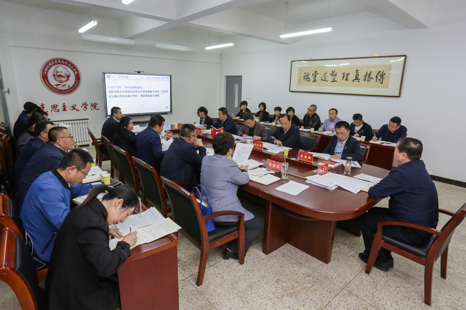 會上,常委們在馬克思主義學院黨委副書記、院長張莉的帶領下,認真學習中共中央辦公廳印發的《關于加強新時代馬克思主義學院建設的意見》文件精神,深刻領會加強新時代馬克思主義學院建設的重大意義、思想方法,并結合我校馬克思主義學院的現實情況,以問題為導向,重點圍繞加強馬克思主義理論學科建設、提升思想政治理論課教學實效、強化課程體系和教材體系建設等15項內容進行了逐一討論研究,針對性明確了具體舉措,并原則上通過了我校關于加強新時代馬克思主義學院建設的實施方案。