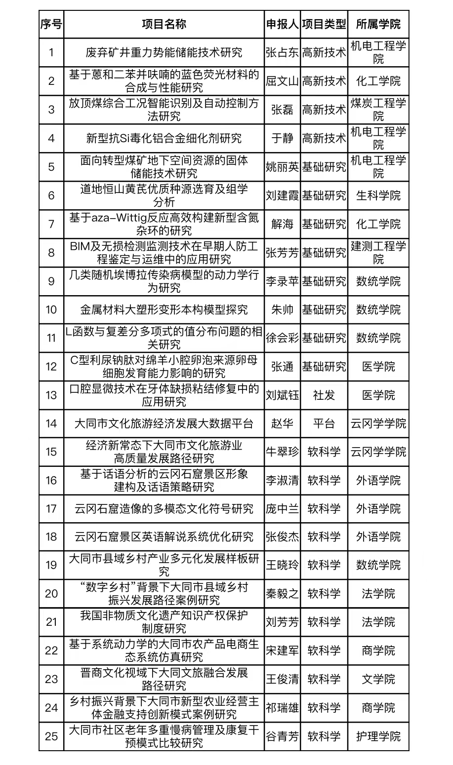 近日,大同市科學技術局公示了2022年大同市科技計劃擬立項項目名單,我校共25項獲得立項,其中高新技術項目4項,基礎研究項目8項,社發項目1項,軟科學項目11項,平臺項目1項。
