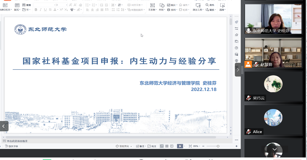 12月8日下午,人文社科部邀請東北師范大學經(jīng)濟與管理學院博士生導師史桂芬教授在線舉行2023年度國家社科基金項目申報經(jīng)驗分享交流會。會議由趙慧勤部長主持,40余名教師參加了此次線上會議。