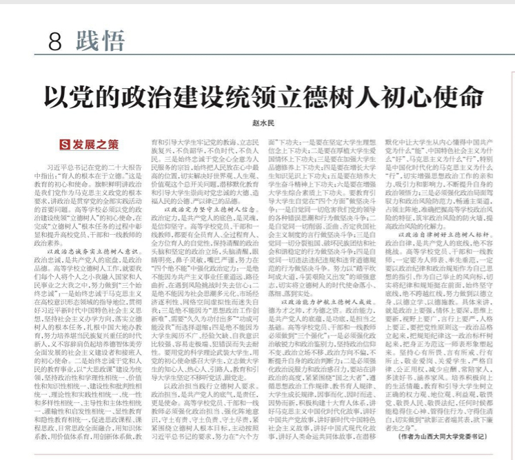 2022年12月27日,《山西日報》在第八版頭條位置上,刊發了我校黨委書記趙水民同志的署名文章《以黨的政治建設統領立德樹人初心使命》。全文如下: