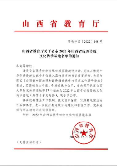 ? 近日,山西省教育廳公布了2022年山西省優秀傳統文化傳承基地名單,我校申報的云岡舞傳承基地成功入選。開展優秀傳統文化傳承基地建設活動是我省深入推進中華優秀傳統文化全方位融入高校美育教育的重要舉措,是省教育廳為貫徹落實《山西省全面加強和改進新時代學校美育工作若干措施》而開展的重要活動。據悉,經各高校自主申報、專家遴選與公示,2022年度全省共認定了 37個傳承基地。自2018年至2020年,全省共批準46個優秀傳統文化傳承基地,我校報送的云岡雕塑藝術傳承基地成功入選2020年度山西省優秀傳統文化傳承基地。