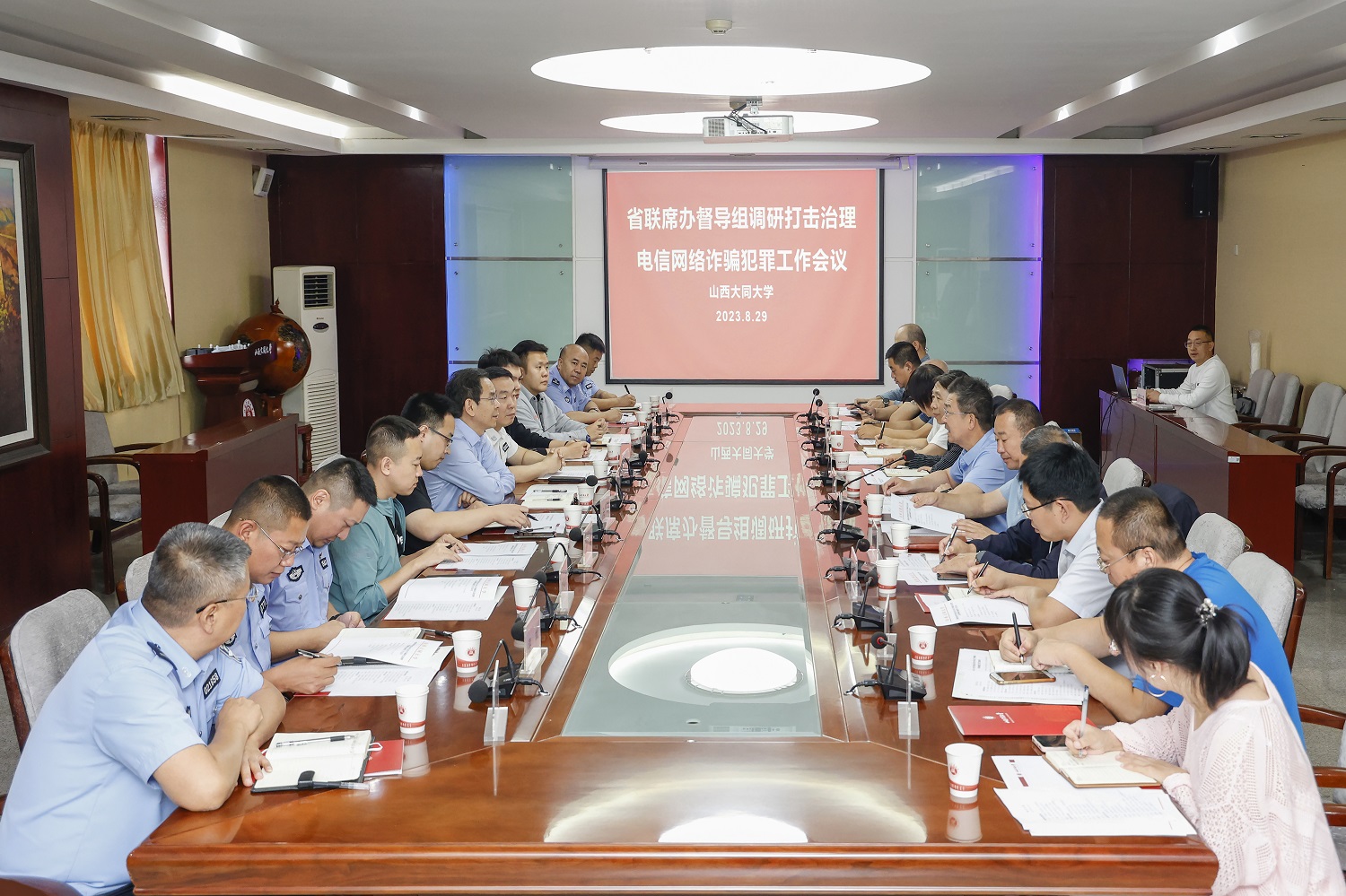 8月29日上午,省聯席辦督導組組長、省高院二級巡視員周太生,省高院刑一庭三級主任科員馬青、省公安廳刑偵總隊四級警長嚴鵬,忻州市公安局反詐中心政委孫浩,呂梁市公安局反詐中心四級警長李嘉祥一行5人來校調研打擊治理電信網絡詐騙工作。校黨委常委、副校長張旻主持調研座談。大同市公安局黨委副書記、常務副局長孫志遠,市公安局反詐中心政委王志華等隨同調研。黨委宣傳部、黨委保衛部、黨委學工部、法學院、外語學院、美術學院有關人員及輔導員代表參加調研。