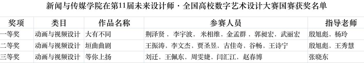 近日,第十一屆未來設計師全國高校數字藝術設計大賽(NCDA)全國總決賽獲獎名單公布。我校新聞與傳媒學院選送的參賽作品榮獲全國一等獎1項,二等獎1項,三等獎1項。