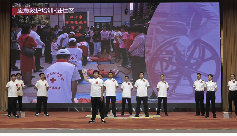 此次大賽由我校組隊代表大同市參賽,他們的口號是“關愛生命,救在大同,鄰里守望,天下大同。”大同市紅十字會秘書長王亮擔任領隊,校紅十字會秘書長張麗萍擔任教練,醫學院7位學生參賽。