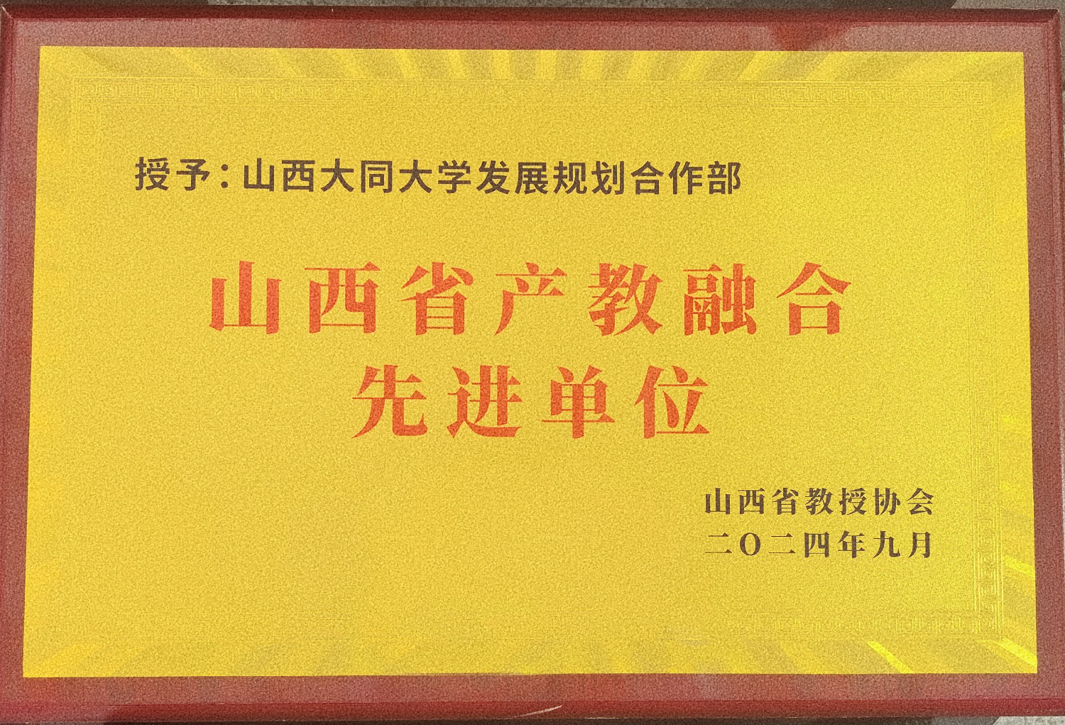 近日,山西省教授協會發布了《關于2024年教師節擬表彰先進集體和個人的公示》,對我省在教育領域作出杰出貢獻的集體和個人進行表彰。經過嚴格評選,我校發展規劃合作部被授予“山西省產教融合先進單位”榮譽稱號。