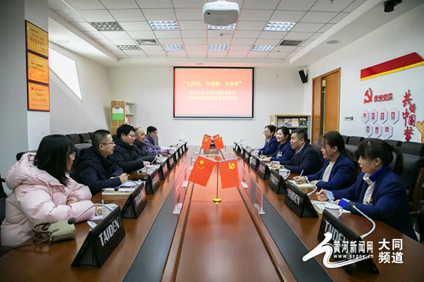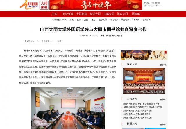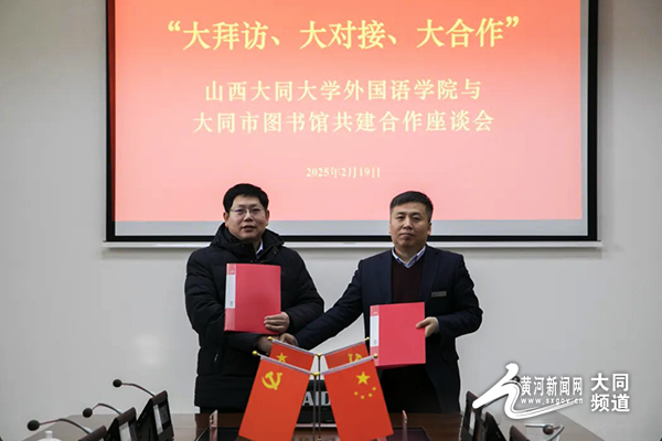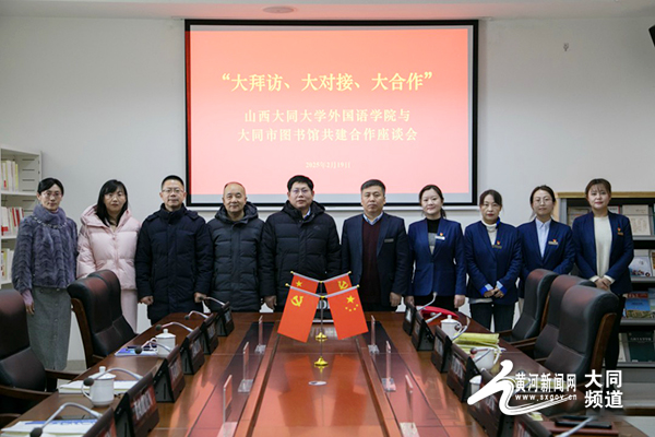 黃河新聞網大同訊(記者 常偉)2月19日,“大拜訪、大對接、大合作”山西大同大學外國語學院與大同市圖書館共建深度合作座談會于大同市圖書館圓滿舉行。此次座談會聚焦雙方既有合作的延續拓展以及新項目的創新構建,山西大同大學外國語學院黨委書記張俊杰、山西大同大學外國語學院黨委副書記趙志國、山西大同大學外國語學院副院長耿小超、山西大同大學外國語學院團委書記耿婷婷、山西大同大學外國語學院團委副書記段捷,以及大同市圖書館黨總支書記、館長陳來義,大同市圖書館副館長呂鑫、大同市圖書館辦公室主任高中麗等雙方領導共同參會,以高瞻遠矚之姿,共探合作新航道,擘畫協同發展新圖景。
