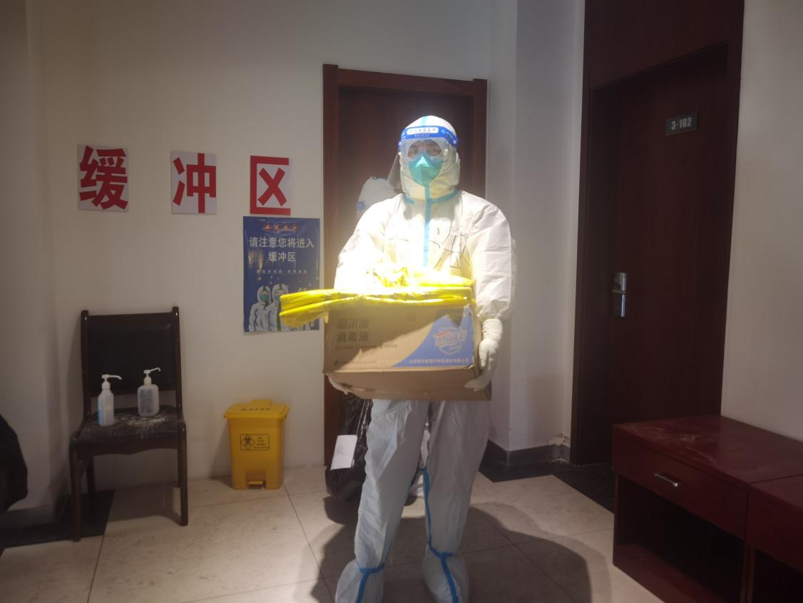 到了市委黨校隔離點后,葛福鴻便馬不停蹄地開始了各項工作,協助專班摸清每位學生的基本情況,建立臺賬;當起了“服務生”,了解學生的困難,協助專班解決學生的心理、生活等方面的問題;當起了“搬運工”,穿著厚重的、不透氣的防護服,為學生送上熱乎的飯菜和急需生活用品,清理生活和醫療垃圾。忙完每日工作,雖精疲力竭、腰酸背痛,但能在困難時期為學校分憂解難,為學生提供保障服務,從內心里感到所有的付出是值得的。