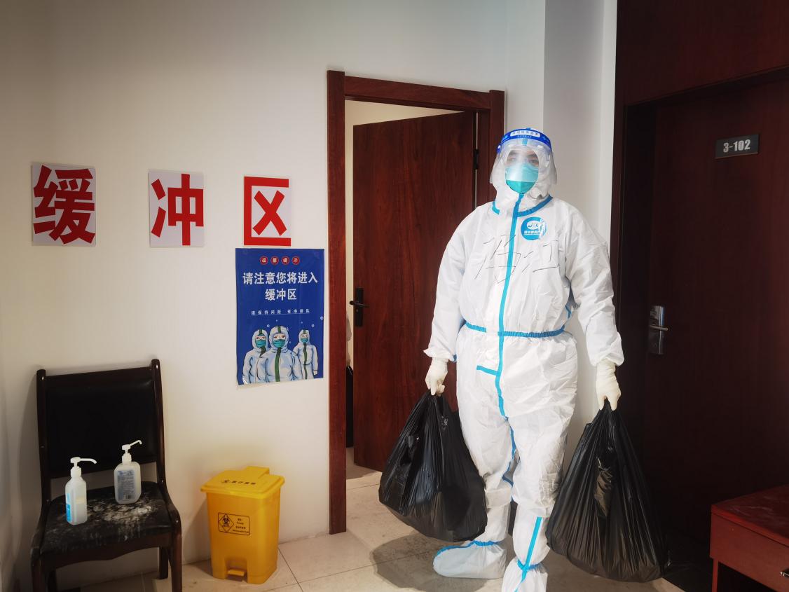 在進駐封閉區的這段日子里,他服務的是一個“特殊”的群體——進行健康監測的出艙學生。從這一刻起,他化身“家政服務生”為同學們提供送餐、垃圾清運、生活必需品傳遞等工作,每天穿脫防護服多次、徒步上下5層樓多次。從早上5點核酸檢測開始直至深夜,為同學們提供熱菜熱飯、急需的生活用品等,他在厚厚的防護服包裹下疾步行走,每每都是汗水打濕了全身、大口大口吸著空氣。每當結束一次次的工作,脫下防護服的那一刻,盡管筋疲力竭、衣裳盡濕但收獲的是滿滿的自豪和滿足,覺得所有的辛苦都是值得的。在這次戰“疫”中,他沒有旁觀,勇于擔當,用付出和真心譜寫著抗疫的華章。