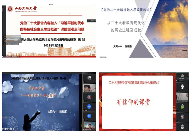 大同六中思政課高級教師韓紅雁以“中國人中國夢——解讀黨的二十大中國式現代化”為主題,從《道德與法治》教材出發,將黨的二十大精神與教材知識相結合,從理論實踐相結合、教法學法相結合等維度,為參會教師開拓了將黨的二十大精神更好、更準、更精地融入思想政治理論課教學中的新思路、新方法。