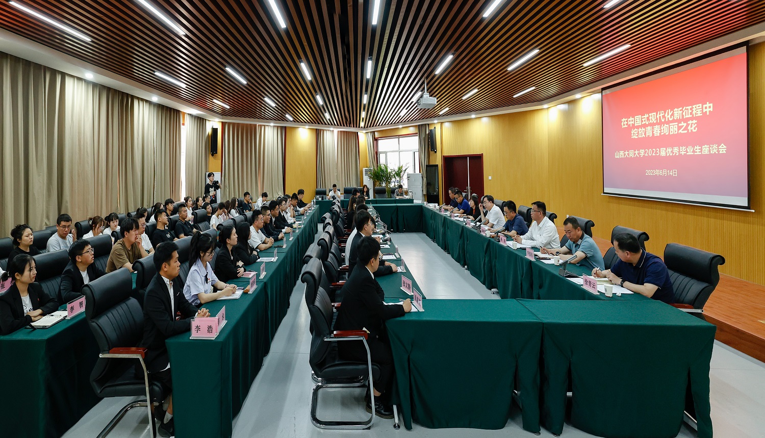 趙水民與同學們熱烈互動交流,暢談黨的二十大精神的學習心得,回顧學校近年來的發展成就,共話學校今后的建設發展和同大學子的美好前程,代表學校祝賀8246名2023屆畢業生學有所成、順利畢業,并欣慰地說,同學們的發言情真意切、信心滿滿,處處流露著對母校的深厚感情與支持,無不彰顯出同大人的能力氣質與胸懷抱負,是同大人才培養水平不斷提升的生動寫照。