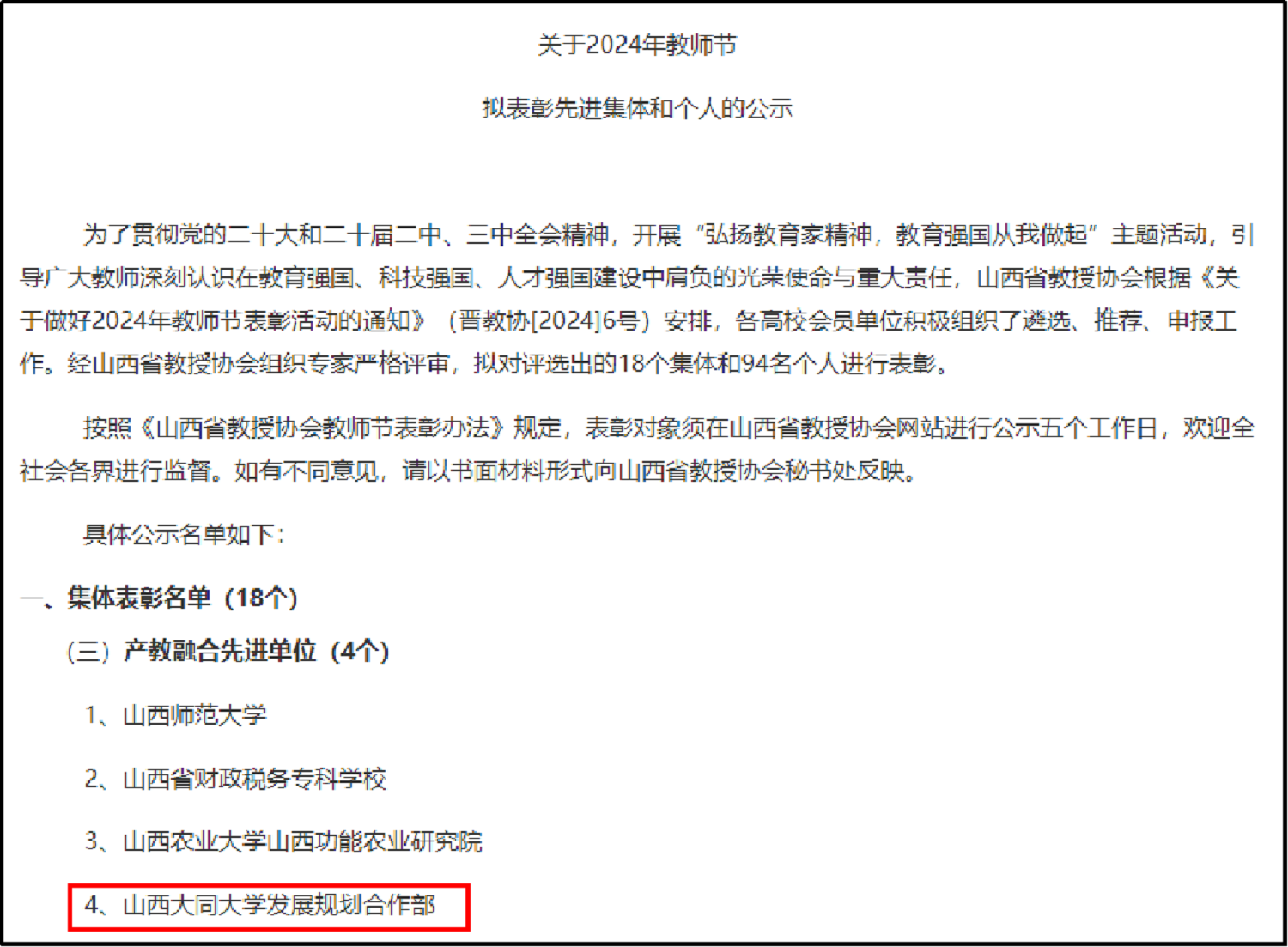 近日,山西省教授協會發布了《關于2024年教師節擬表彰先進集體和個人的公示》,對我省在教育領域作出杰出貢獻的集體和個人進行表彰。經過嚴格評選,我校發展規劃合作部被授予“山西省產教融合先進單位”榮譽稱號。