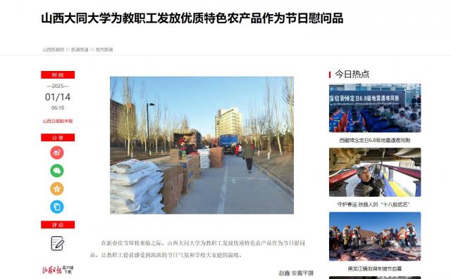 在新春佳節(jié)即將來臨之際,山西大同大學(xué)為教職工發(fā)放優(yōu)質(zhì)特色農(nóng)產(chǎn)品作為節(jié)日慰問品,讓教職工提前感受到濃濃的節(jié)日氣氛和學(xué)校大家庭的溫暖。
