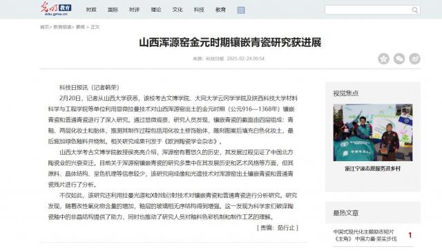 山西大學(xué)考古文博學(xué)院教授侯亮亮介紹,渾源窯有著悠久的歷史,其發(fā)展過程見證了中國北方陶瓷業(yè)的興衰變遷。目前關(guān)于渾源窯鑲嵌青瓷的研究多集中在其發(fā)展歷史和藝術(shù)風(fēng)格等方面,但其原料、晶體結(jié)構(gòu)、呈色機理等信息較少,該研究用成像和光譜技術(shù)對渾源窯出土鑲嵌青瓷和普通青瓷殘片進行了分析。